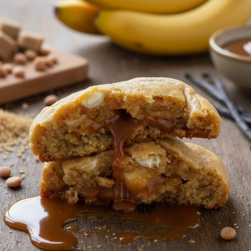 At the center lies a smooth caramel filling, baked to a warm, molten core that flows into the dark chocolate base.